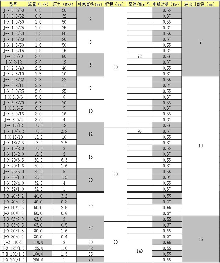 J-X系列配置表: